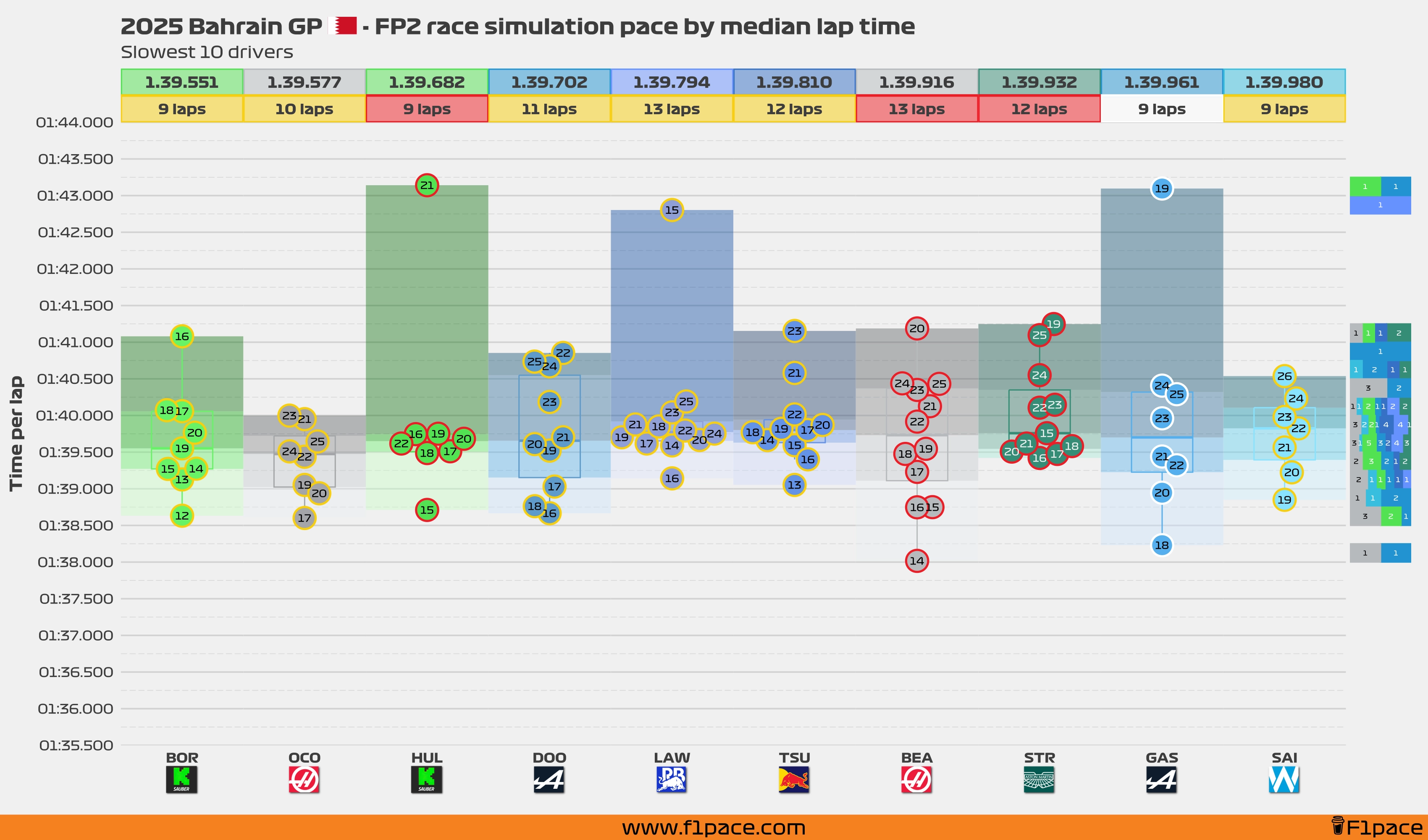 - If you do not see a driver in the plot, it is because he did not do a proper race simulation stint during the practice session.